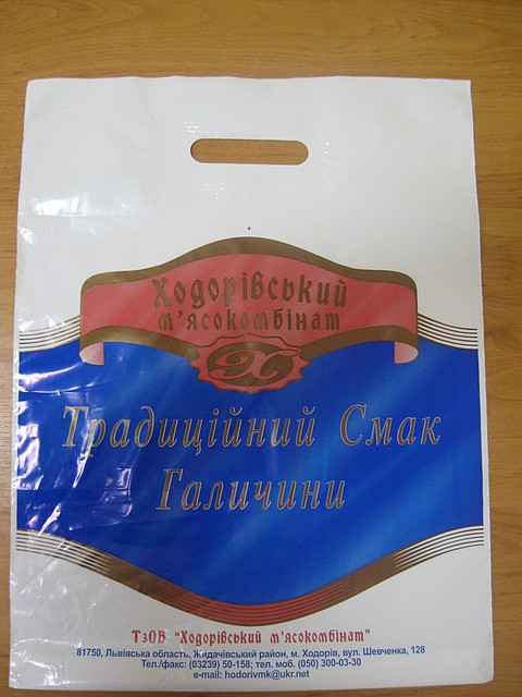 Пакет із прорізною ручкою ПВД (LDPE) М'ясо комбінат. друк у 3 кольори, є посилена ручка!